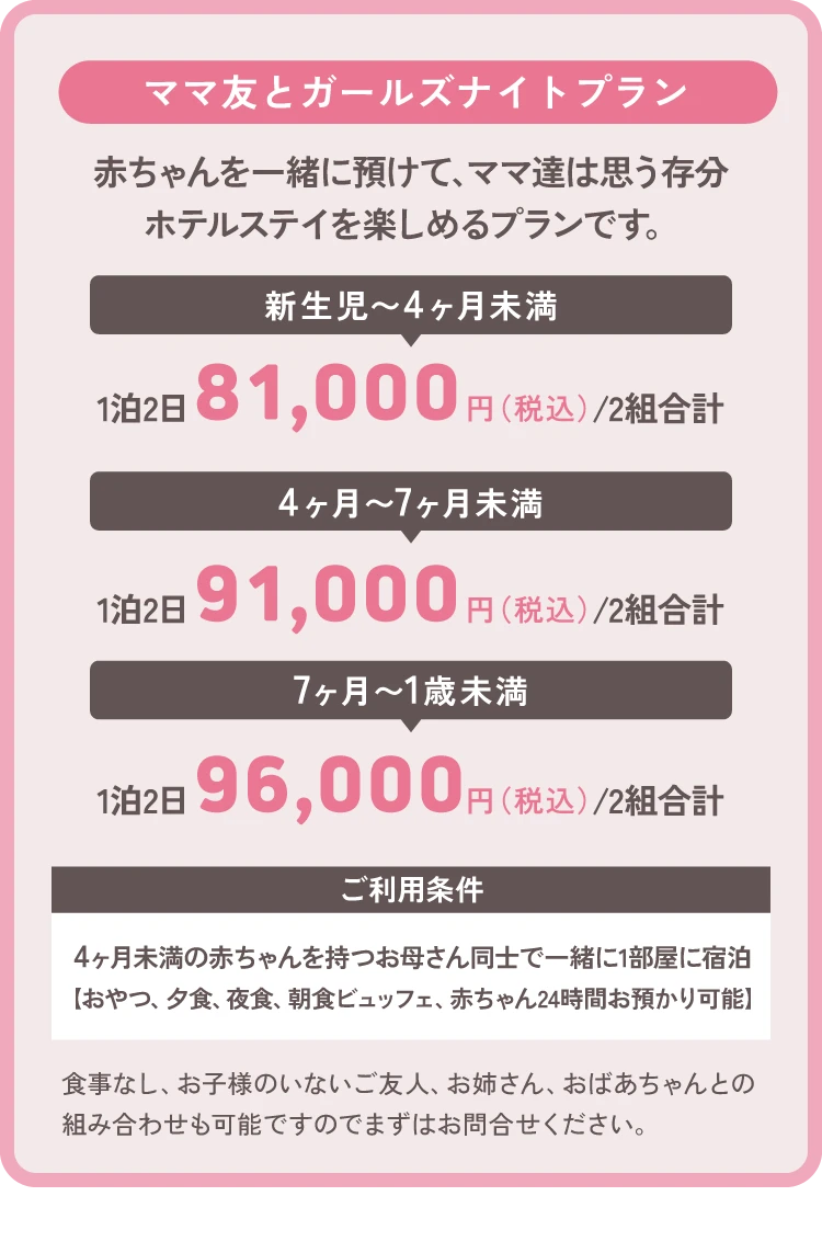 - 4ヶ月〜1歳未満:1泊2日73,000円(税込)〜